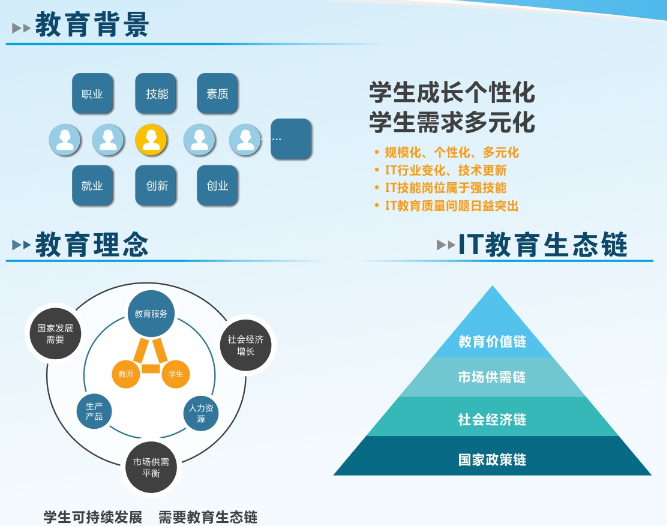 為改善這種現(xiàn)狀,非常需要學(xué)校與企業(yè)共同教育的模式,在聯(lián)合教學(xué)上,厚溥做得非常好。與接觸到的其他培訓(xùn)機(jī)構(gòu)相比,厚溥團(tuán)隊(duì)對(duì)于教育的領(lǐng)悟更深入,本質(zhì)領(lǐng)會(huì)更到位。厚溥資源豐富,但更重要的是內(nèi)容、方法、管理三個(gè)方面,學(xué)校可以通過購買優(yōu)質(zhì)服務(wù)來提升自己辦學(xué)水平。