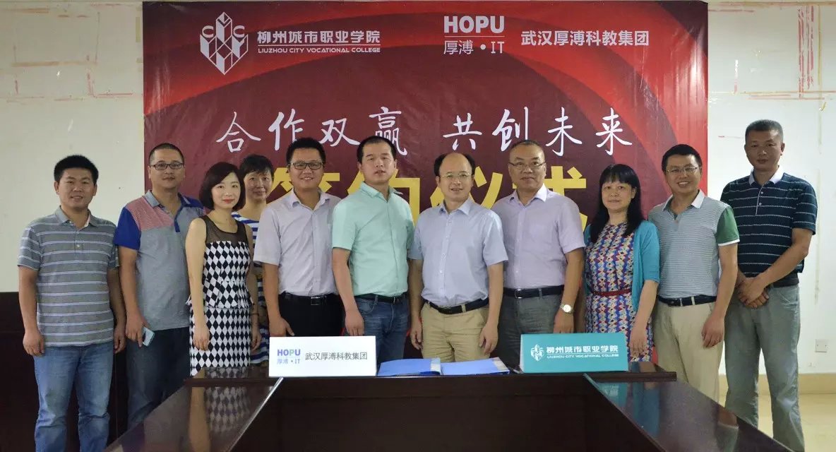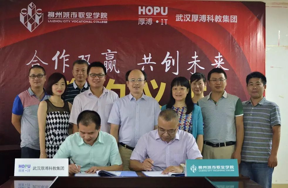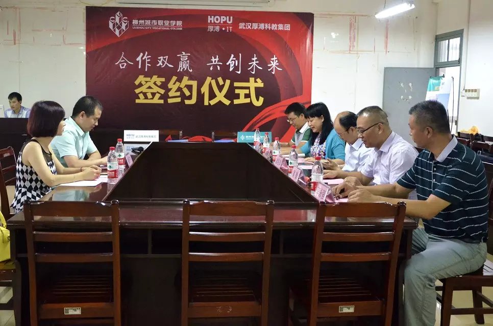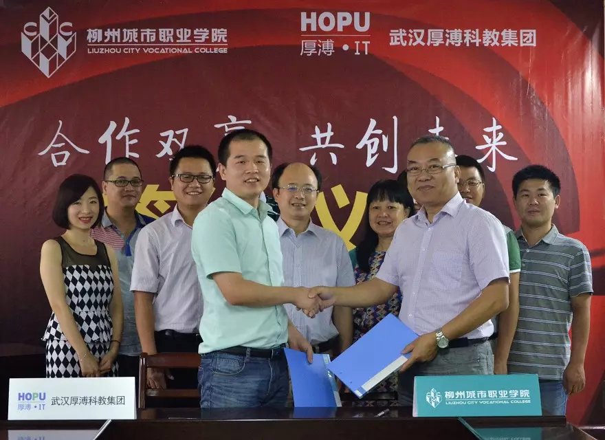 7月23日上午,武漢厚溥教育科技有限公司在柳州城市職業學院,與校方簽訂校企合作協議聯合辦學,建立“厚溥軟件學院”。武漢厚溥教育科技有限公司常務副總兼技術總監翁高飛、戰略發展部市場總監李薇薇出席簽約儀式,柳州城市職業學院院長謝名洋、副院長黃鋒、黨政辦主任黃?、教務處處長陳柳艷、信息工程系主任唐子蛟、系黨總支書記李永強共同參加簽約儀式。