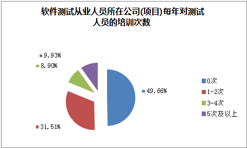 然而,在被調查者所在公司中,測試人員與開發(fā)人員的比例在1:4及以上的高達55.13%。在這些公司中,49.66%的公司每年對測試人員進行的培訓次數(shù)為0。也就是說,將近一半的軟件測試人員在工作后沒有進行培訓學習的機會,這就要求想從事軟件測試的人員在入職前培訓相關的技能,確保工作可以順利開展。