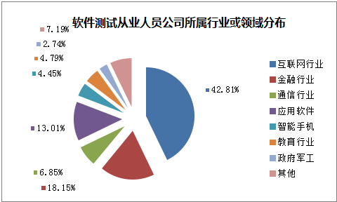 數(shù)據(jù)顯示,被調查測試人員所屬公司中,互聯(lián)網(wǎng)行業(yè)及金融行業(yè)分別占42.81%和18.15%,綜合占比超過六成,這也印證了經(jīng)濟結構調整的成果,目前互聯(lián)網(wǎng)行業(yè)和金融行業(yè)受到了投資者和個人的青睞,企業(yè)需求急劇上升,軟件測試人才缺口巨大。